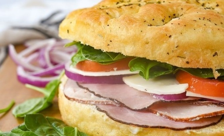 White ciabatta bread with ham, cheese and salad.